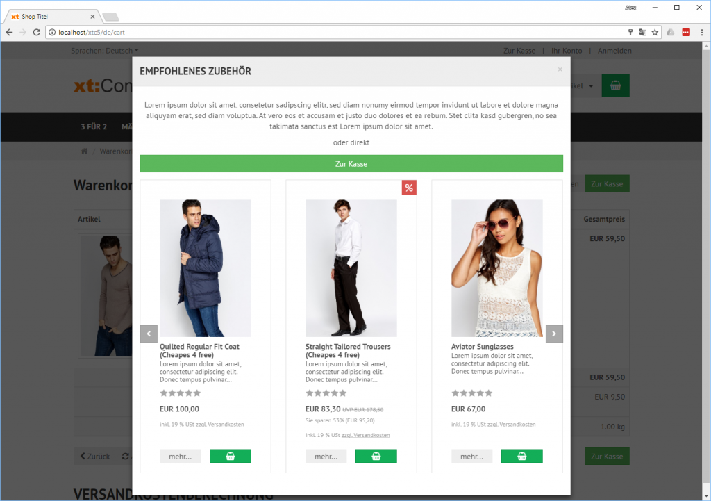 Als Datenquelle für die Produkte die angezeigt werden, dient das xt:Commerce-Plugin xt_cross_selling. Im Warenkorb wird eine Auswahl der für die im Warenkorb befindlichen Produkte angezeigt.