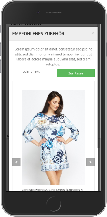 Die Popup-Funktion stellt sicher, dass der Kunde die Crossseling-Produkte sieht, bevor er in den Bestellabschluss navigiert. Das Popup wird dem Kunden erst angezeigt, nachdem der Kunde auf den Knopf “Zur Kasse” klickt und zeigt die Zubehörprodukte im Zentralen Bereich der Seite.