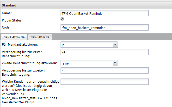 | Verzögerung bis zur zweiten Benachrichtugung: | Wie lange nachdem der erste Artikel in den Warenkorb gelegt wurde, soll die zweite Erinnerungsmail versendet werden? Angabe in vollen Stunden. | 48 |