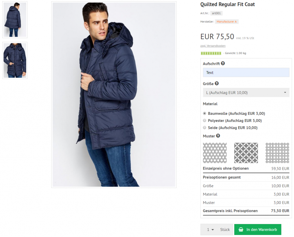 Ein Beispiel wäre, wenn Sie bedruckte T-Shirts verkaufen, jedes Shirt hätte die Optionen “Größe” und “Farbe”.