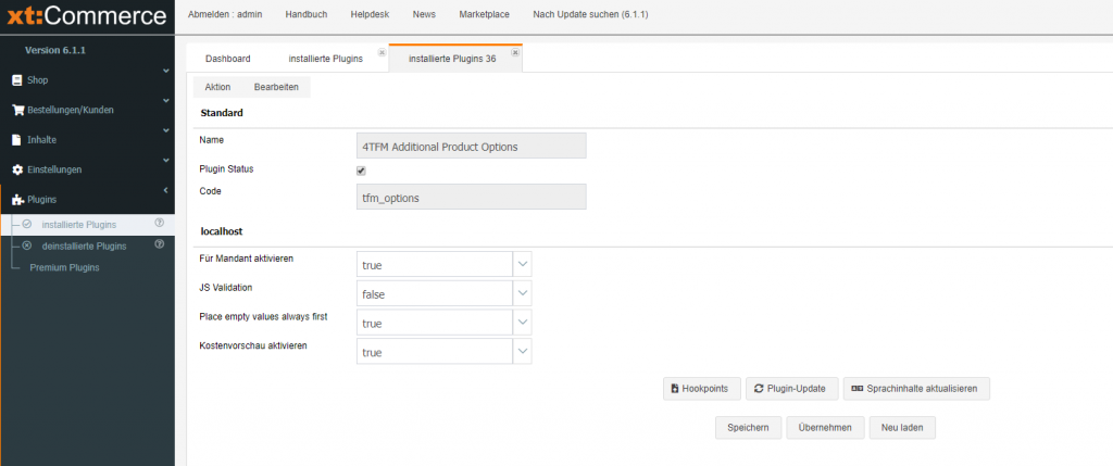 Nachdem das Plugin installiert und aktiviert ist, laden Sie den Administrationsbereich mit der F5-Taste neu