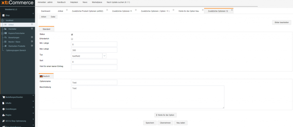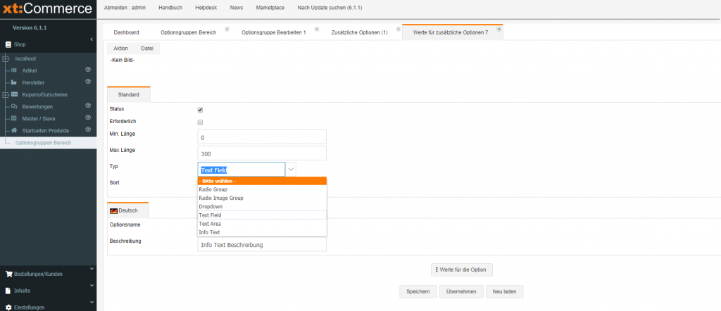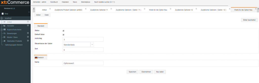 Dort können Sie über den Klick auf “neu”, eine Option anlegen.
