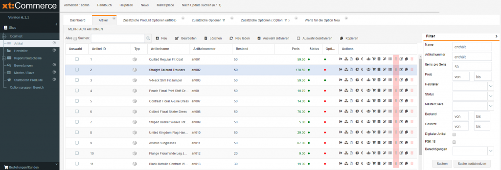 Um einen Produkt eine einzelne Option zuzuweisen, gehen Sie über das Backendseitenmenü auf Shop -> Artikel und klicken Sie beim gewünschte Produkt auf die drei untereinander liegenden Punkte.
