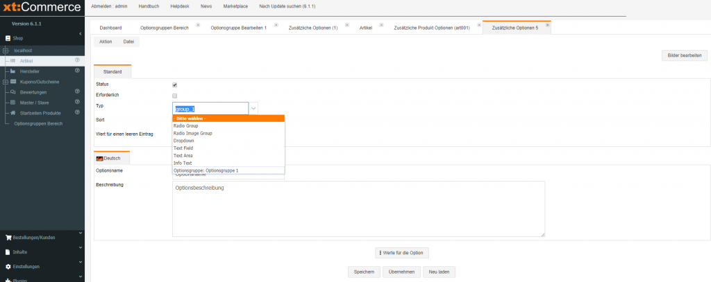 Ebenso können Sie Optionsgruppen erstellen, welche auf mehreren Artikeln angewendet werden können.