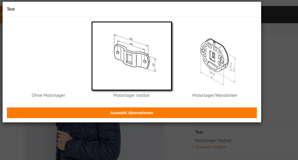 Gibt einen klickbaren Link mit “Auswahl auswählen” aus. Beim Klick auf den Link öffnet sich ein Modal, in welchen man, wie beim Typ Radio Image, eine Bildauswahl hat.Der Vorteil im Modal ist jedoch, dass die Bilder größer dargestellt werden.