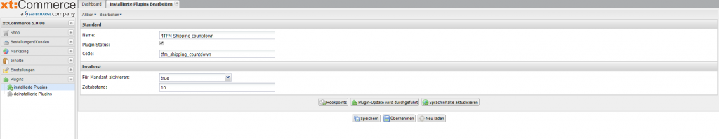 Nach der Plugininstallation, öffnen Sie die Plugin-Konfiguration, welche Sie in Ihrem Shop-Backend unter “Plugins => Installierte Plugins => tfm_shipping_countdown (bearbeiten)” finden.