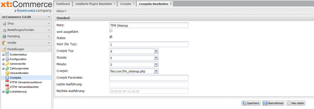Mit der Installation des Plugins, sollte die Datei “cron.tfm_sitemap.php” (aus dem Verzeichnis “plugins/tfm_sitemap/cronjob“) in das Verzeichnis “/cronjobs/” kopiert werden. Außerdem wurde ein Cronjob in xt:Commerce (“Einstellungen => Cronjobs“) erstellt. (Sollte nach der Installation die Datei “cron.tfm_sitemap.php” im Ordner “/cronjobs/” nicht vorhanden sein, dann kopieren Sie die Datei aus dem Ordner “/plugins/tfm_sitemap/cronjobs/” dort hin.)
