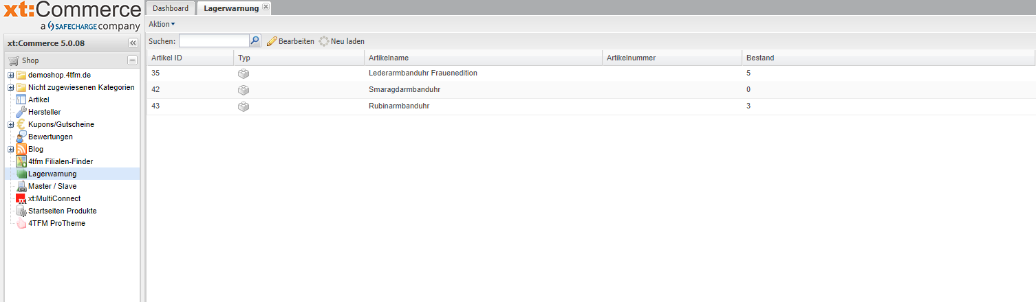 Zusätzlich wird eine Lagerübersicht in das Backend integriert, welche Ihnen alle Produkte auflistet die einen niedrigen Bestand haben.