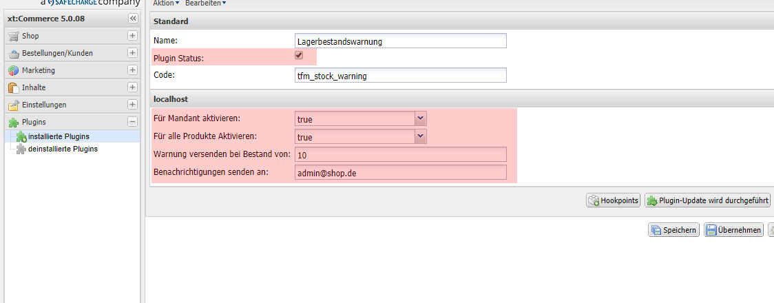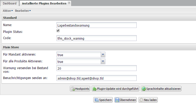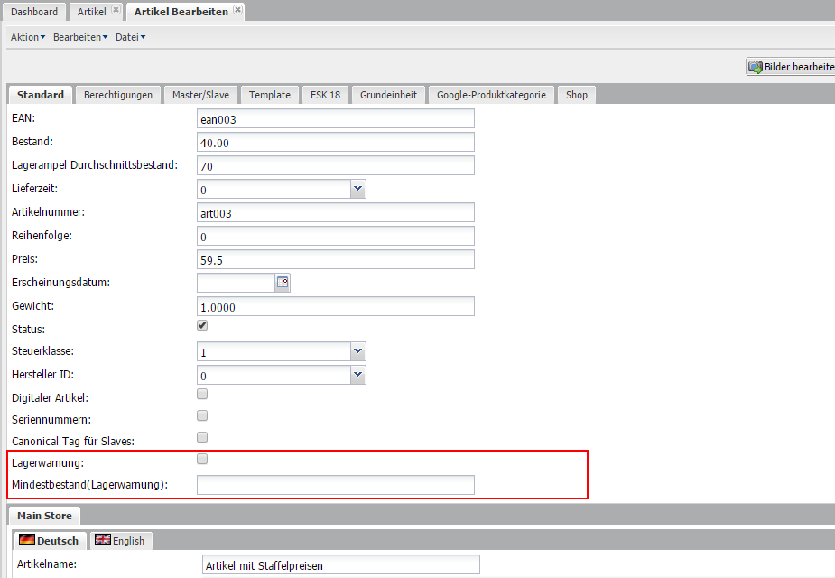 Bitte beachten Sie, dass ein Wert in “Mindestbestand(Lagerwarnung)” immer die Plugin-Option überschreibt.