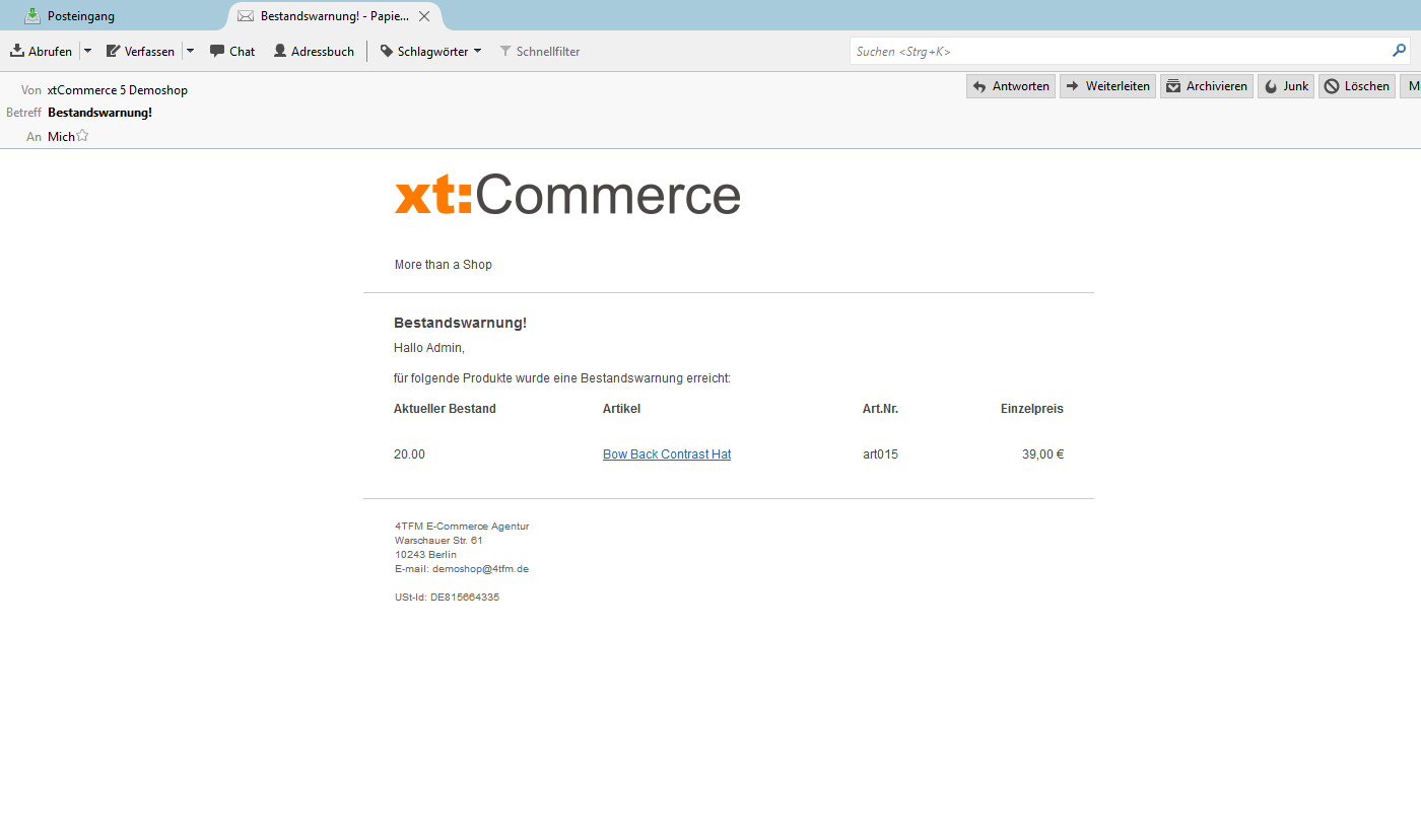 Sollte ein Kunde ein Produkt ein einer Anzahl kaufen, worauf hin diesen den von Ihnen konfigurierten Mindestlagerbestand unterschreitet erhalten Sie eine Benachrichtigung per E-Mail.