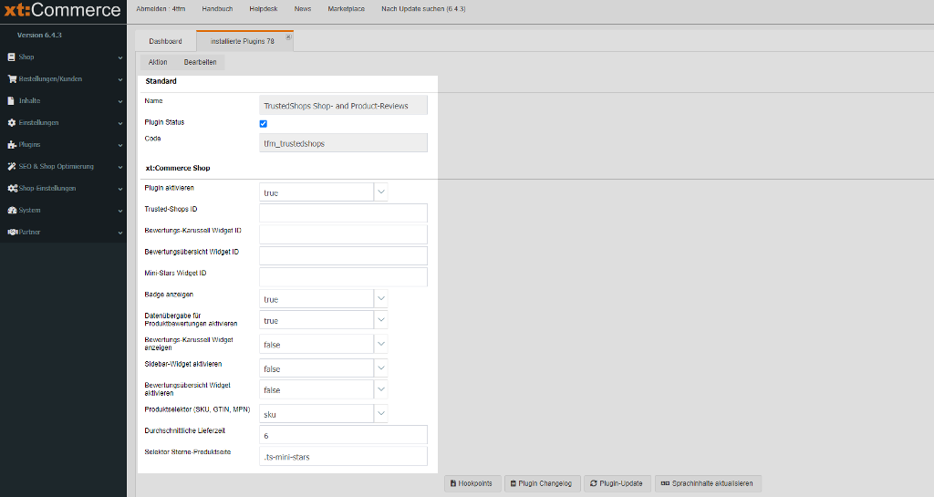 Nach der Plugininstallation, öffnen Sie die Plugin-Konfiguration, welche Sie in Ihrem Shop-Backend unter “Plugins => Installierte Plugins => tfm_trustedshops(bearbeiten)” finden.