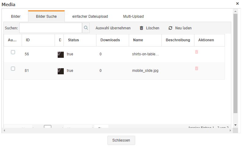 Hierfür müssen Sie im Slide ein zweites Bild hochladen. In dem Media Popup-Fenster finden Sie im Reiter “Bilder Suche” Ihre hochgeladenen Bilder. Das Bild, welches auf Desktop dargestellt werden soll, haken Sie an und klicken auf “Auswahl übernehmen”. Bei dem Bild für Mobilgeräte merken/kopieren Sie sich den Bildnamen und tragen Sie Ihn in der Slide-Option “Bildname (mobil)” ein. Zum Beispiel: