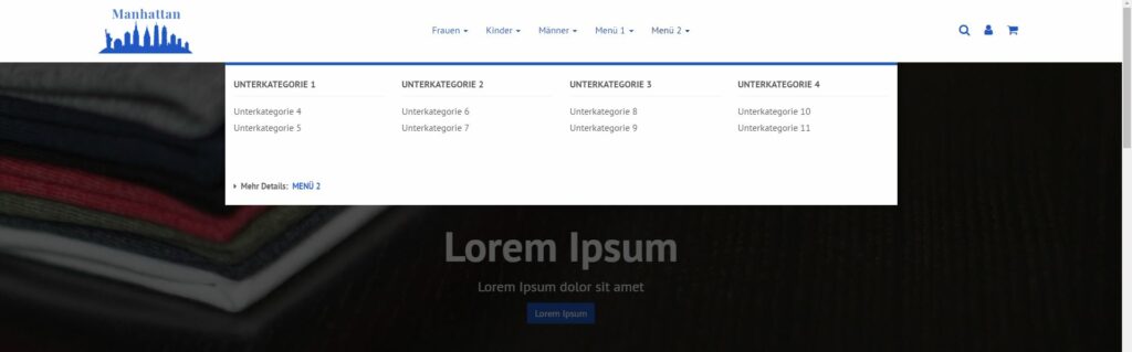 Dort gibt es dann den Punkt “Megamenu Typ”. Sie können hier drei verschiedene Optionen (Manhattan Megamenü, Standard Megamenü, Einfaches Dropdown) auswählen.
