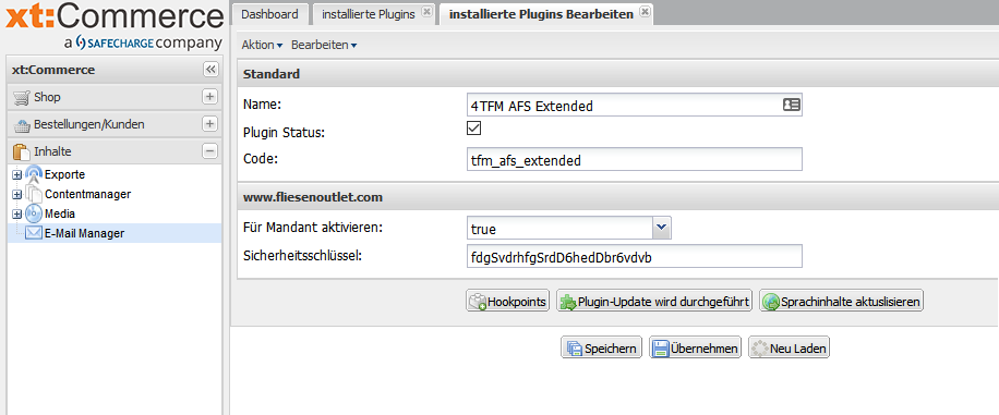Nach der Plugininstallation, öffnen Sie die Plugin-Konfiguration, welche Sie in Ihrem Shop-Backend unter “Plugins => Installierte Plugins => tfm_afs_extended(bearbeiten)” finden.
