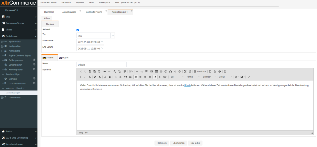 Hier können Sie den Status, den Zeitraum, den Ankündigungstyp, sowie der Ankündigung eine Nachricht geben.