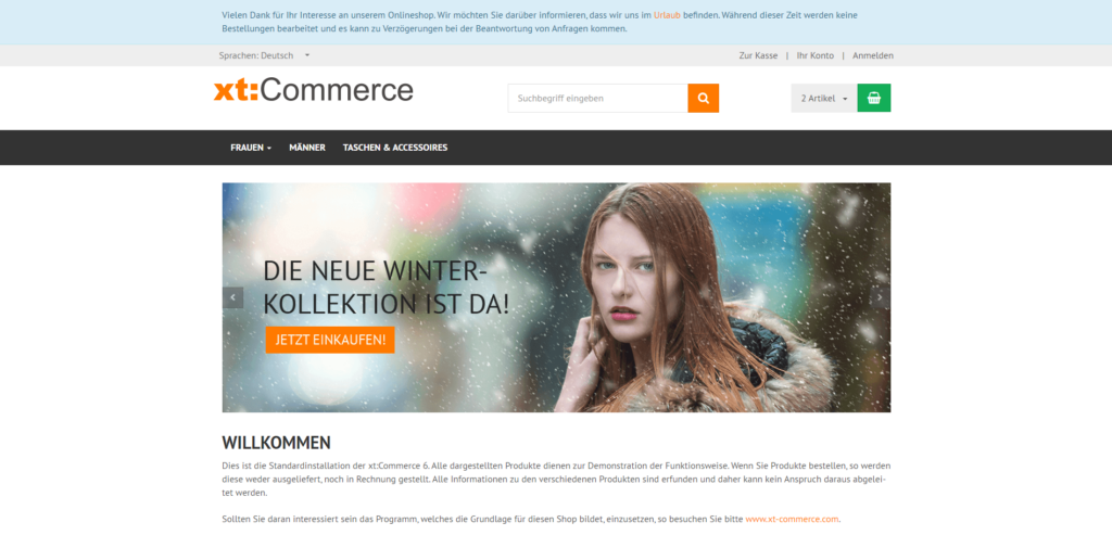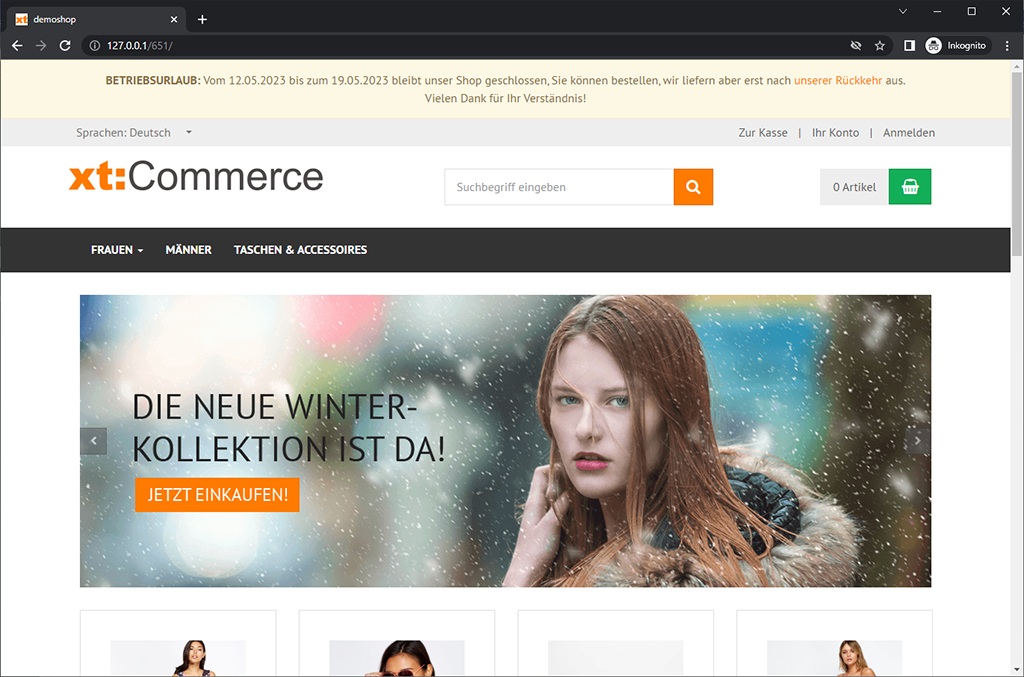 Das Plugin “tfm_announcement_bar” erlaubt es Ihnen Ankündigungen zu bestimmten Zeiten in Ihren Onlineshop zu implementieren. Eine solche Ankündigung kann beispielsweise darauf hinweisen, dass der Shop vorübergehend im Urlaub ist oder für Werbeaktionen oder Lieferinformationen.