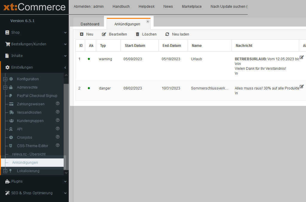 Um eine Ankündigung in Ihren Shop anzulegen, navigieren Sie über das Backend über das linke Menü zum Punkt “Einstellungen” -> “Ankündigung”.