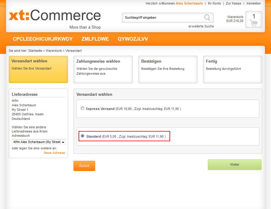 Führt ein Kunde eine Bestellung durch und für Postleitzahl der Versandadresse wurde ein Aufschlag definiert, wird dieses dem Kunden angezeigt und zusammen mit den (normalen) Versandkosten in die Bestellung hinzugefügt.