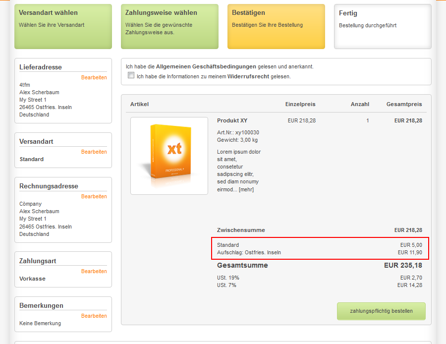 In der Bestellübersicht wird alles wie üblich angezeigt, lediglich die zusätzlichen Kosten werden separat ausgewiesen.