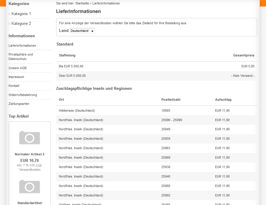 Auf der Lieferinformationen-Seite des Shops werden alle Kosten ausführlich und automatisch aufgelistet.