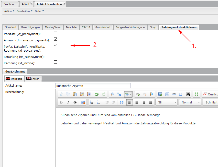Nachdem Sie das Plugin in Ihrem xt:Commerce Shop installiert haben, finden Sie in jedem Produkt den Reiter “Zahlungsart deaktivieren” (“1.” im Screenshot). Wenn Sie den Reiter aktivieren finden Sie eine Liste der in Ihrem Shop aktivierten Zahlungsarten (“2.” im Screenshot).